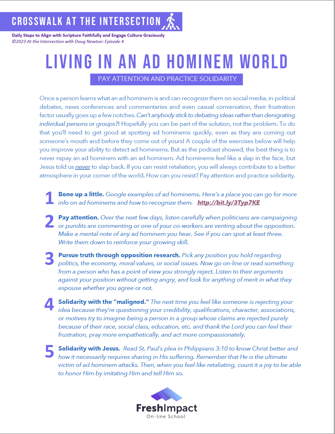In this episode we discovered that developing the skill and strength to handle ad hominems when they are directed toward you requires the ability to recognize and avoid ad hominems, and hardest of all, to resist retaliation. The suggestions you'll find in the downloadable