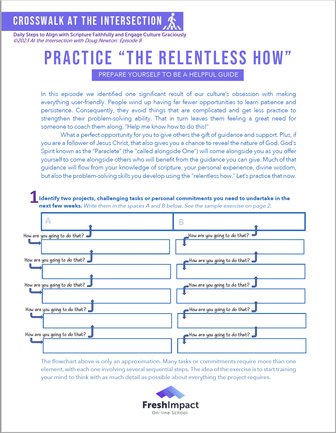The exercises in this Crosswalk guide you in the use of the "relentless how" and then point you outward toward helping others.